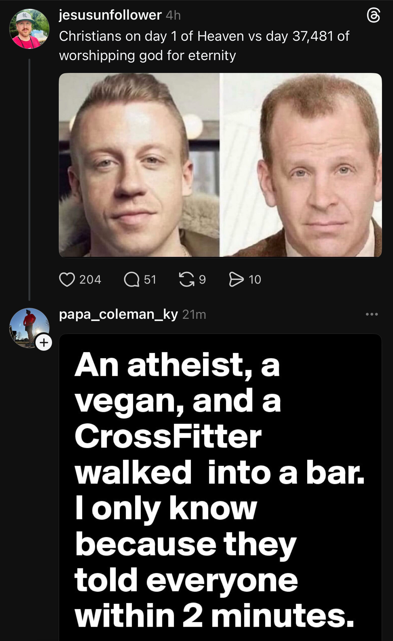 Atheist, Vegan, & Crossfitter walk into a bar...