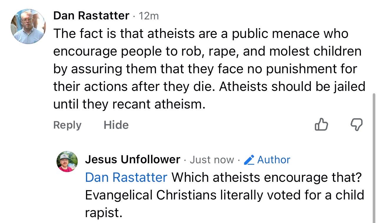 Interesting - so Dan apparently thinks that it is only the threat of post-death consequences (hell) that prevents people from committing crimes. It doesn't occur to him that rational people would simply choose not to "rob, rape, and molest children."