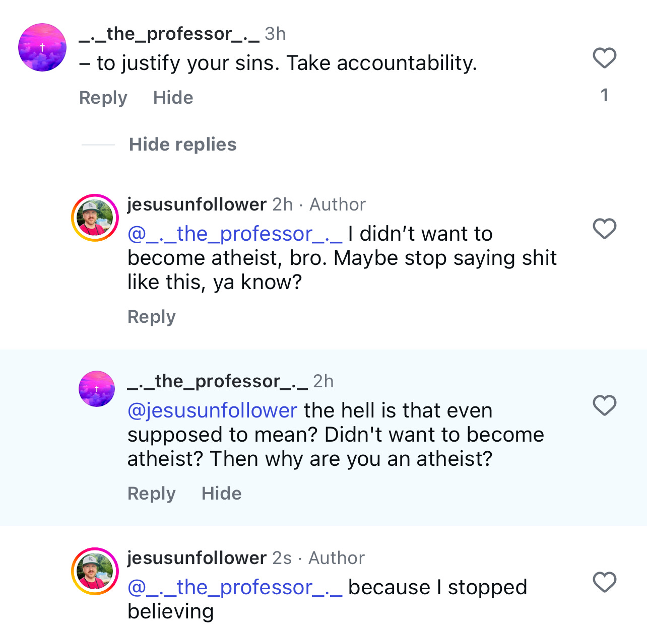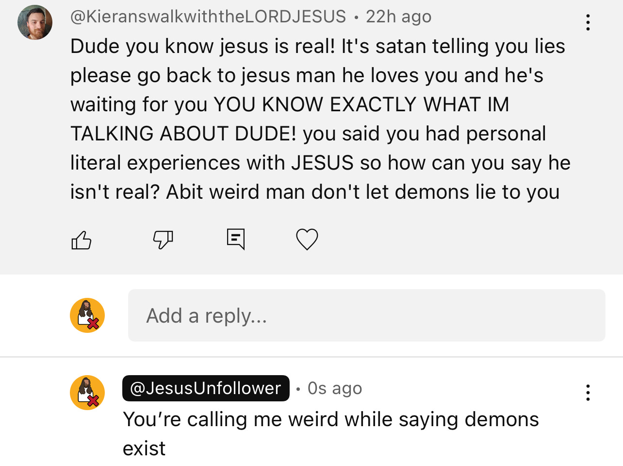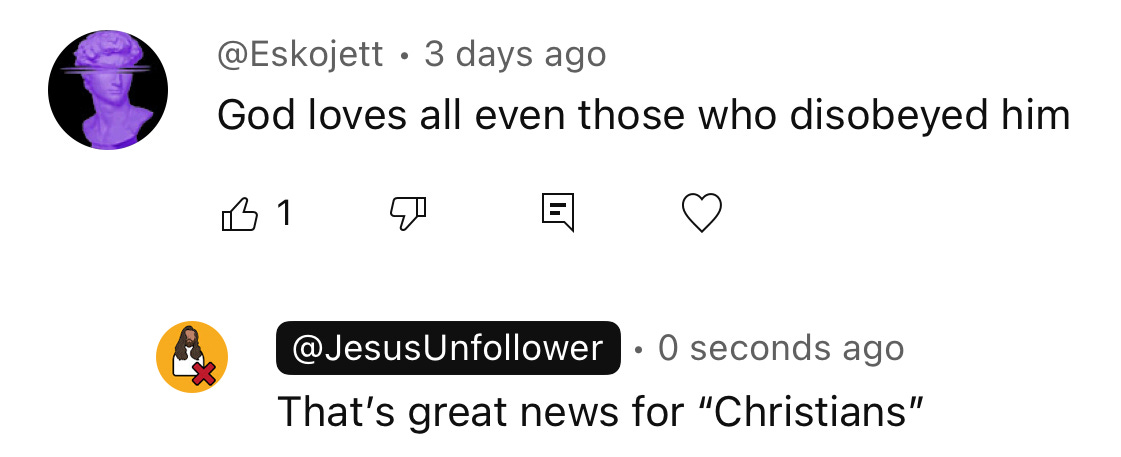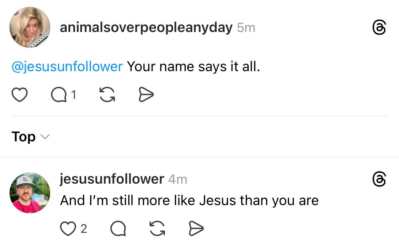 They love the whole “look at your name” thing. Yeah, my handle is Jesus Unfollower; that doesn’t make me a bad person.