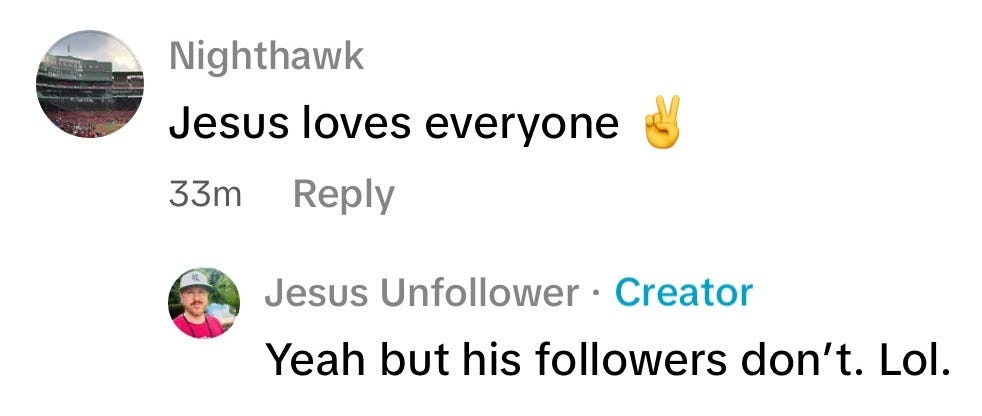I do this to make people laugh, to process religious trauma, and to remind us all we’re not alone in this Christian nationalist hellscape.