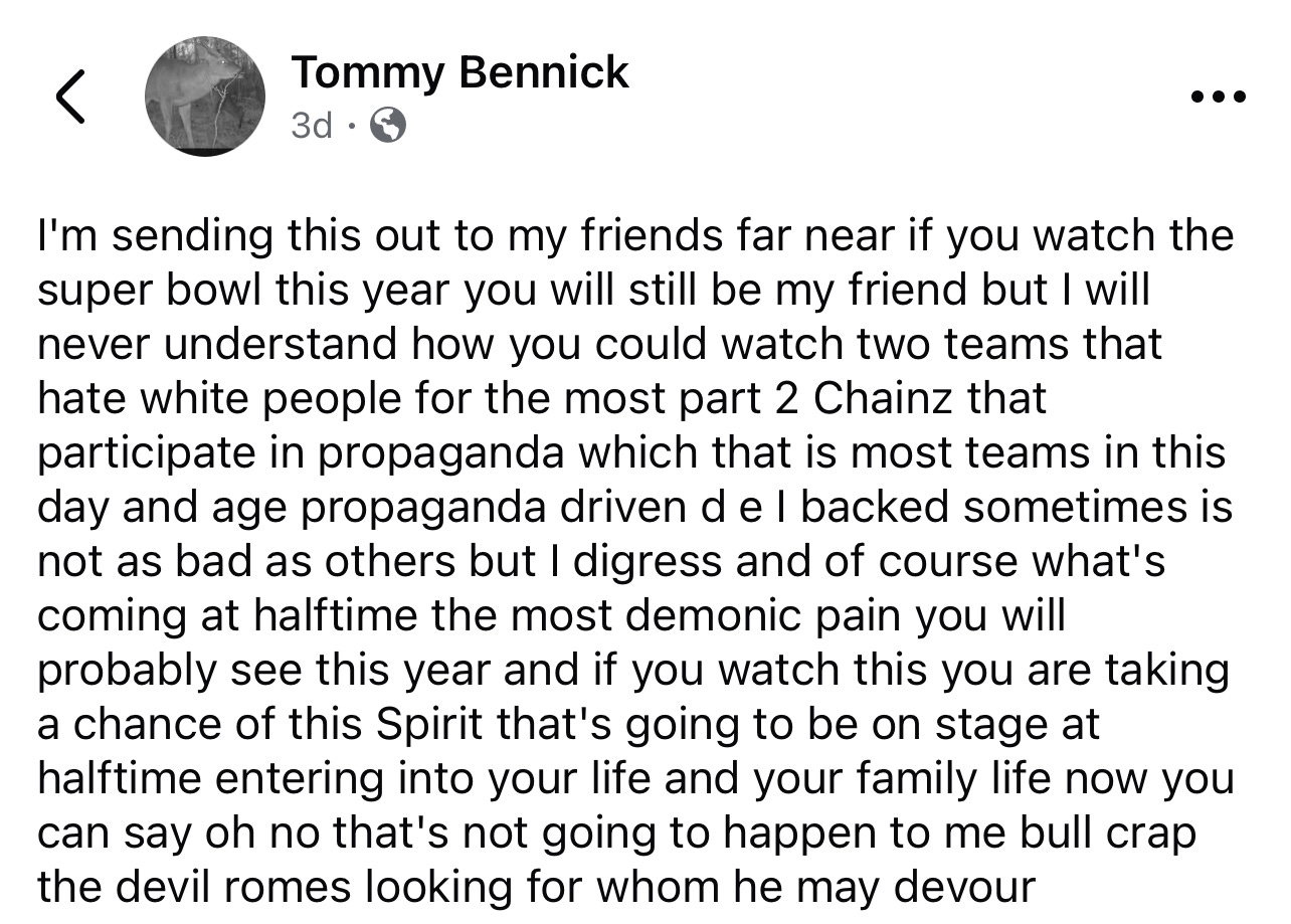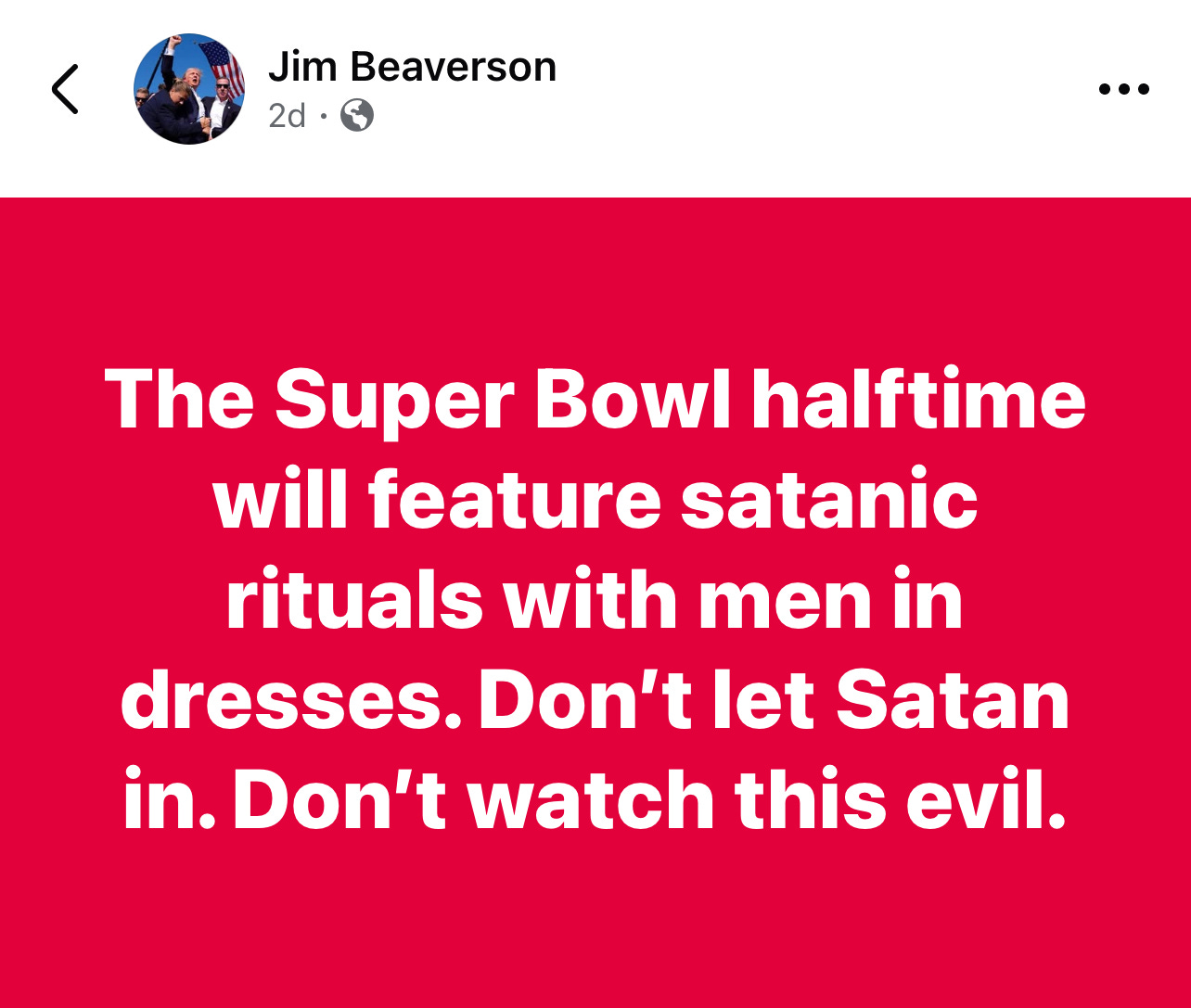 The Super Bowl is coming up, and I know that means that evangelical Christians will be posting about how it’s actually Satan, not Bad Bunny, who is in control of the show.