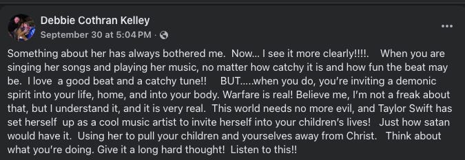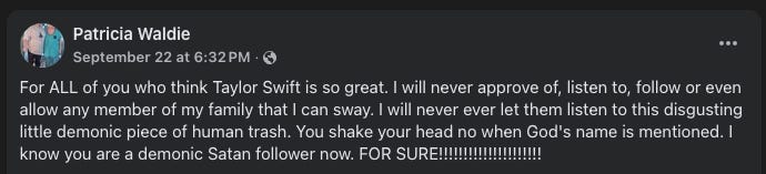 Patricia calls Taylor Swift a “little demonic piece of human trash.”