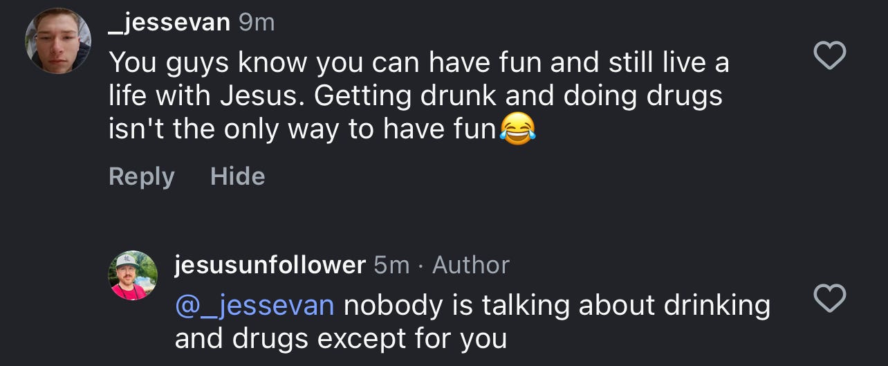 It’s hilarious that they think just because a person doesn’t believe in Jesus, that means they are drinking and doing drugs. I mean, I did both in Denver, but that’s beside the point.