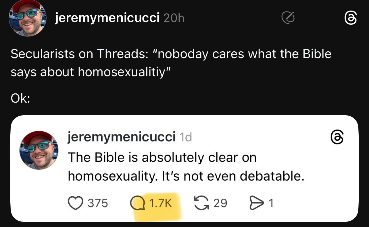 Hey, Jeremy, we don’t care what the Bible says. We care what hateful assholes like you SAY that the Bible says. We care that you want to weaponize your religion. We care that you’re obsessed with everyone’s genitalia and whom they’re fucking.