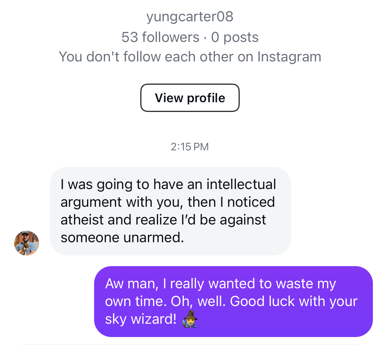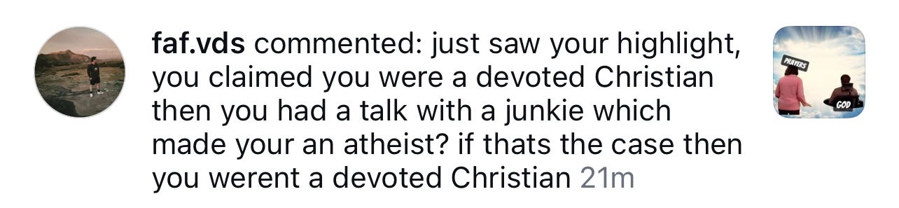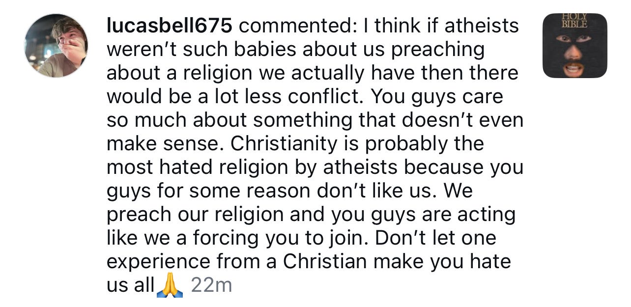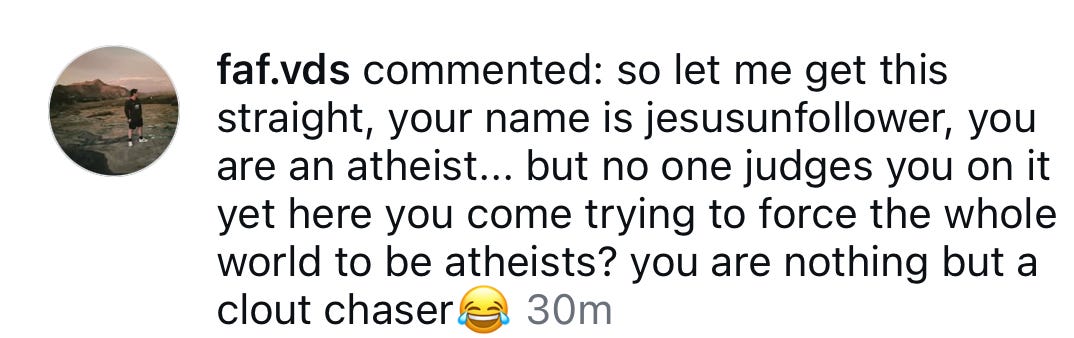 Oh, you thought he was done? Yes, me making content about how I used to be a Christian is forcing the whole world to be atheists.