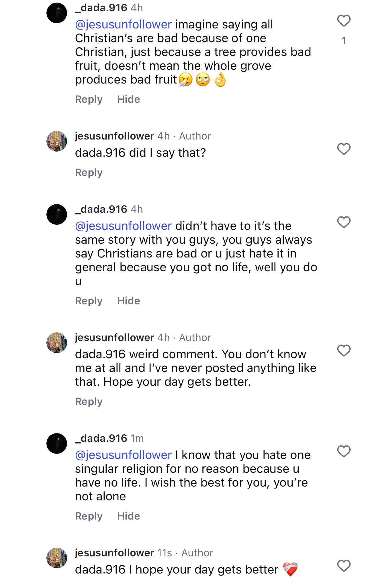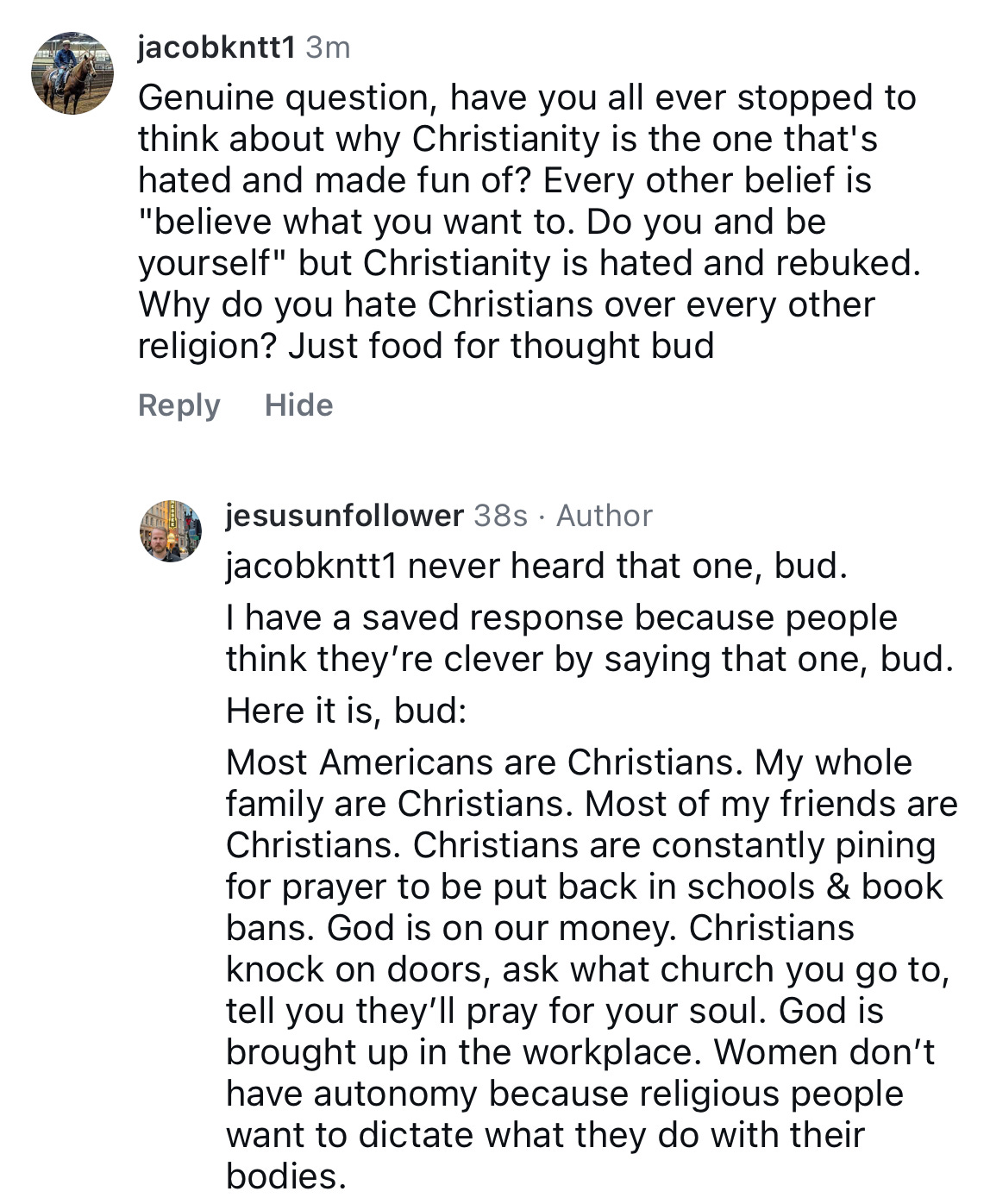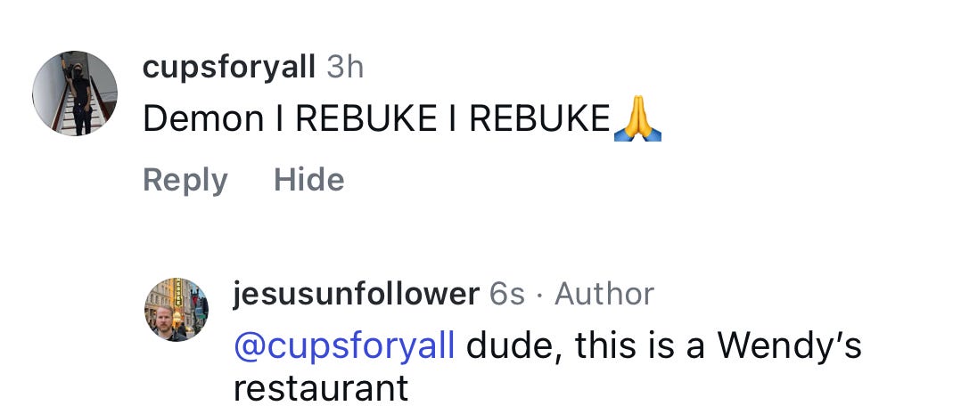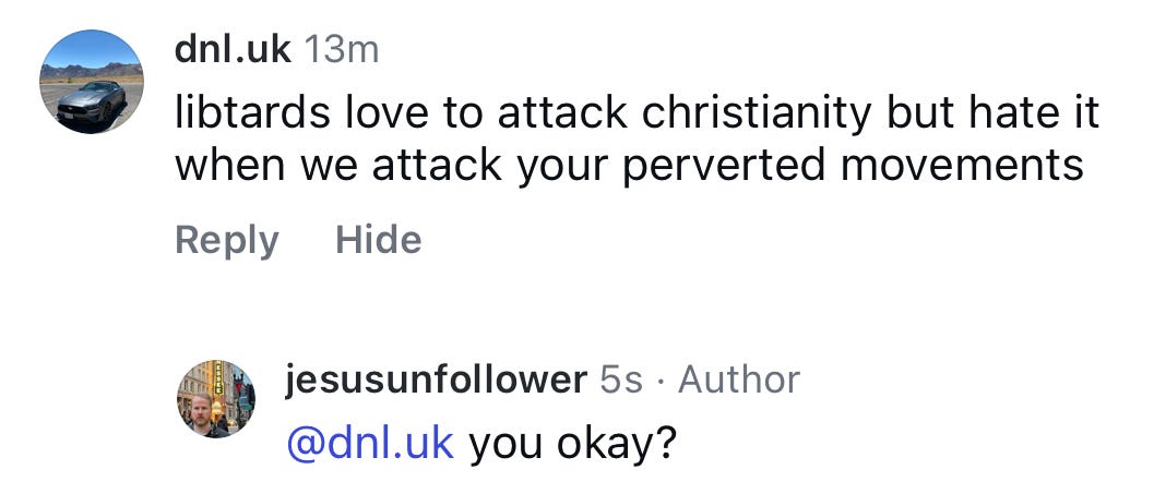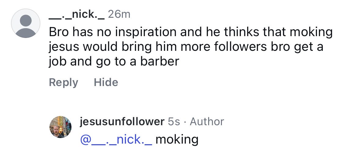 Probably 99% of the worst comments I get have a cross in their bio, and about 79% of those are also a dude holding a fish, crying about the male loneliness epidemic.