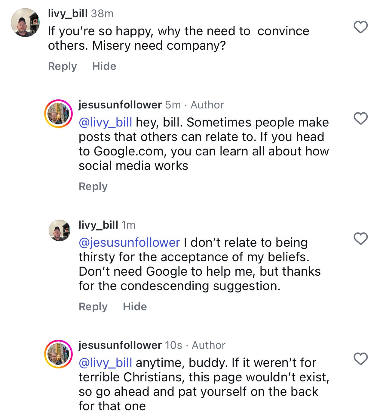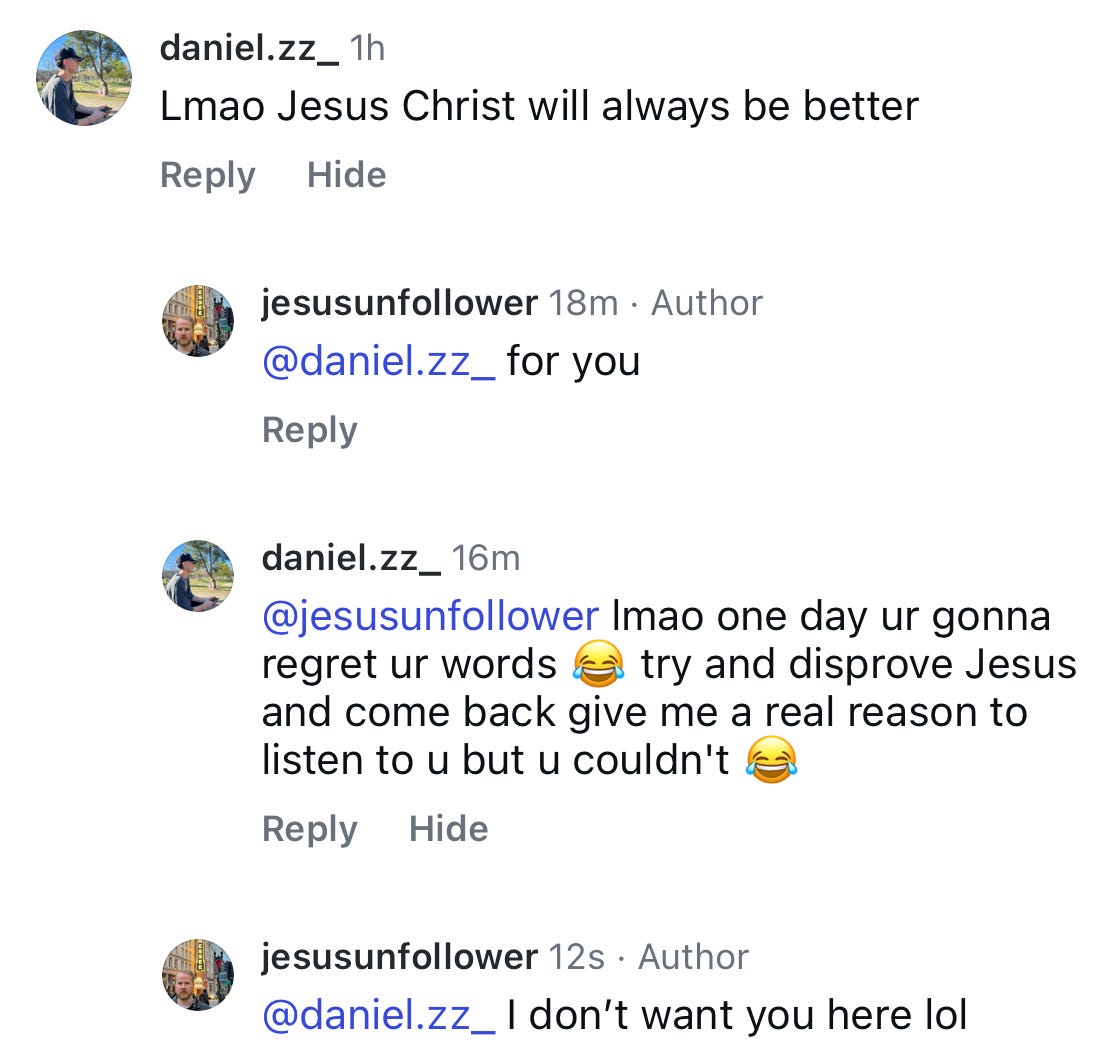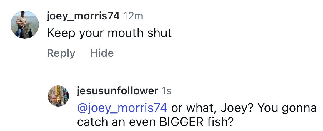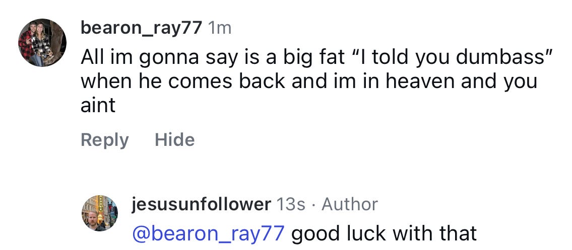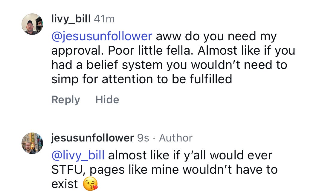 I’m going to start posting and sharing way more of my Jesus Unfollower content on my personal accounts. It should be interesting, but I’m tired of sparing the feelings of those who say whatever they want, whenever they want with no regard for anyone.