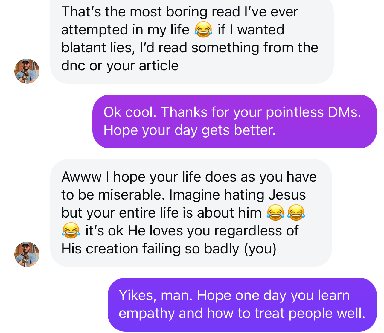 My entire life? My dude, this account is the only thing you know about me. Thanks for continuing to demonstrate the love of Christ.