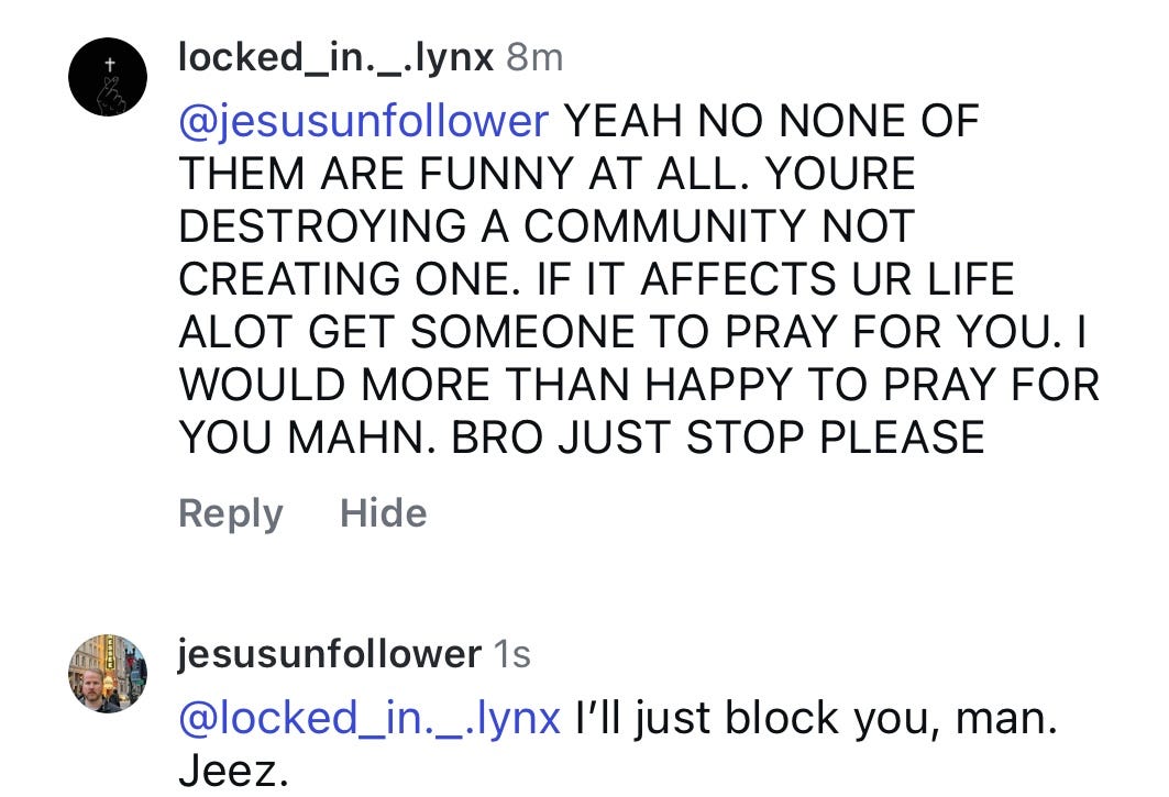 I’m destroying a community by making jokes, memes, and posts that question Christianity? How fragile is your faith?