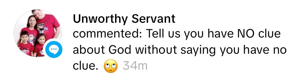 Another person claiming to have all of the answers. There’s something about the juxtaposition of the smiling family with the name “Unworthy Servant” that has me dying.